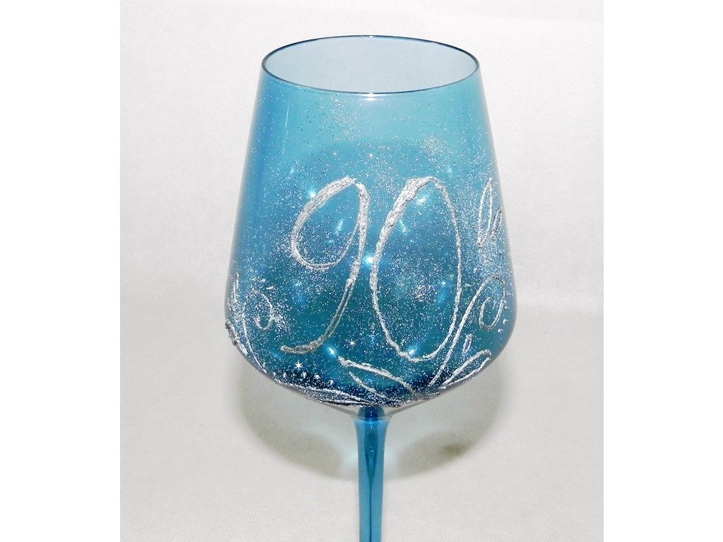 Doprajte oslávencovi dar, ktorý zanechá dojem! Tento nádherný ručne maľovaný výročný pohár v žiarivej modrej farbe je originálnym a štýlovým spôsobom, ako osláviť významné životné jubileum. Trblietavý dekor so strieborným odleskom a elegantnou číslicou „90“ dodáva poháru sviatočný a luxusný vzhľad.