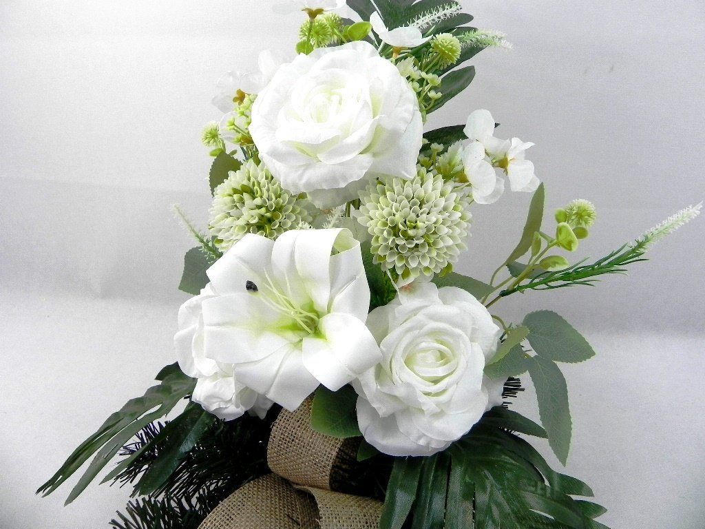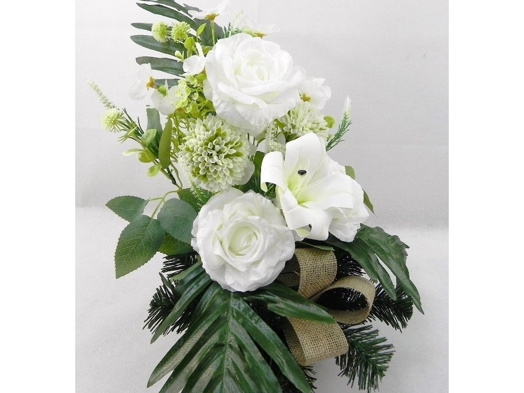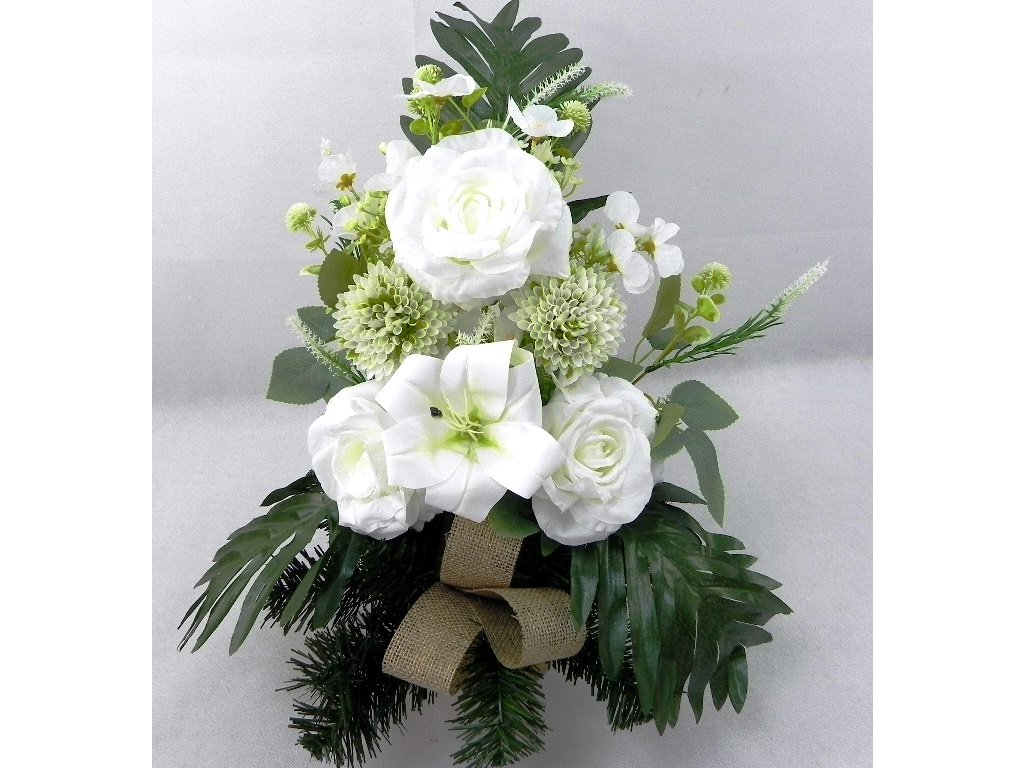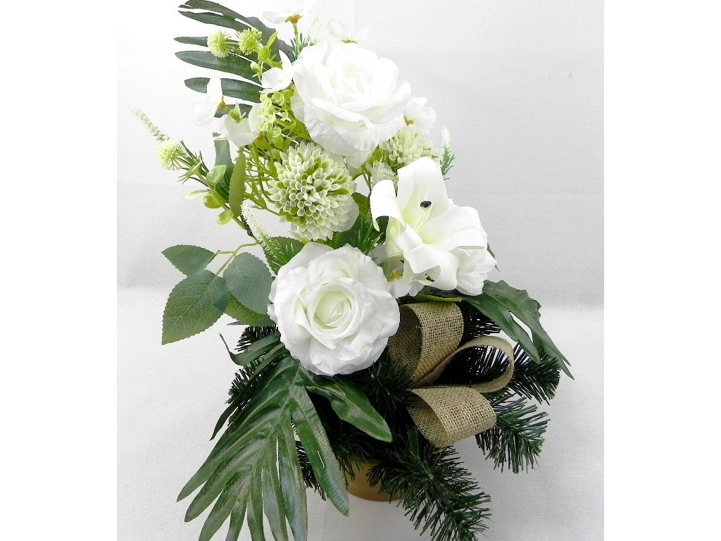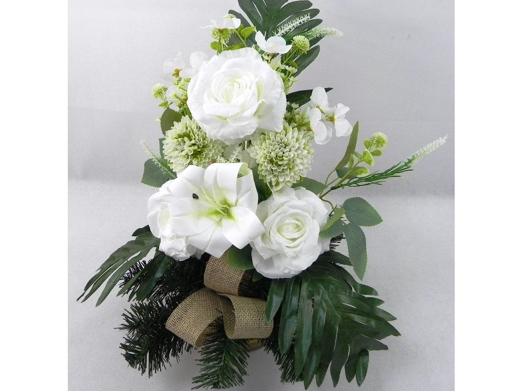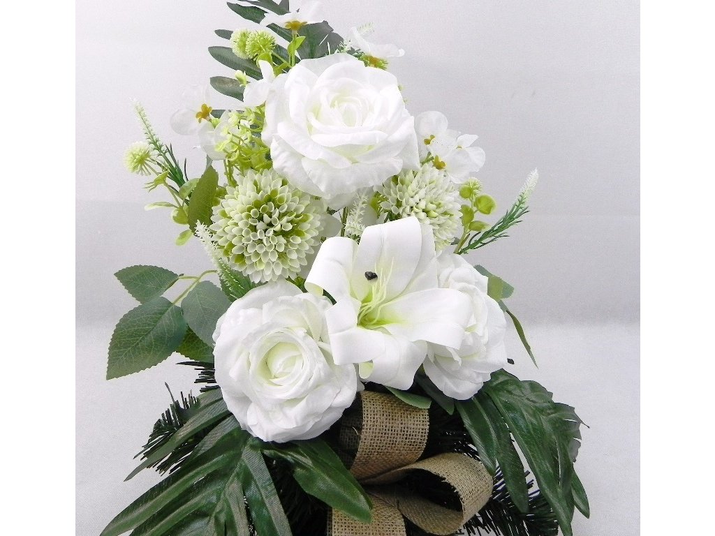 Vysoký aranžmán v zaťaženej miske. Použité krásne ruže a doplnkové kvety.