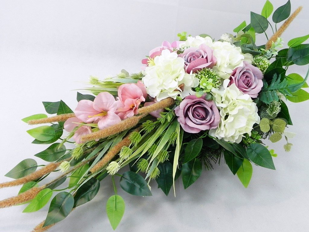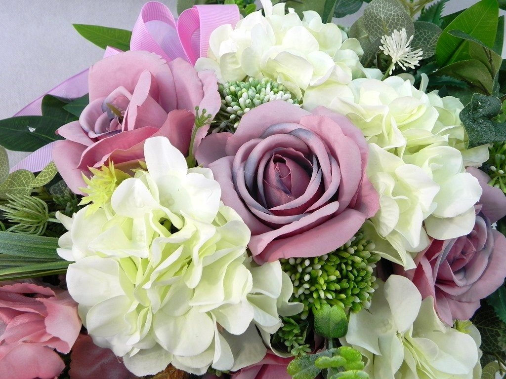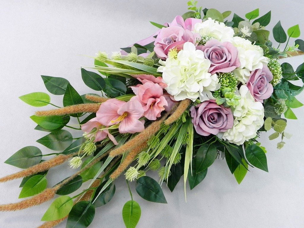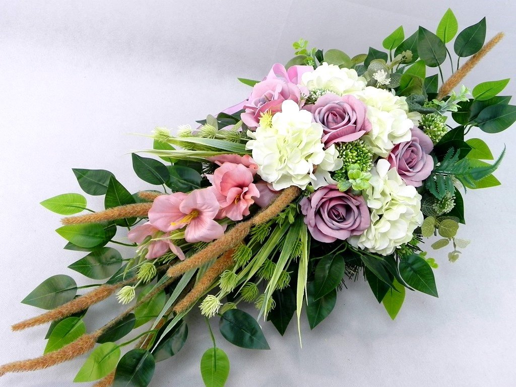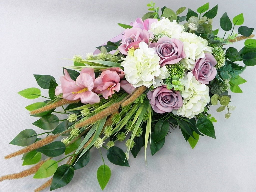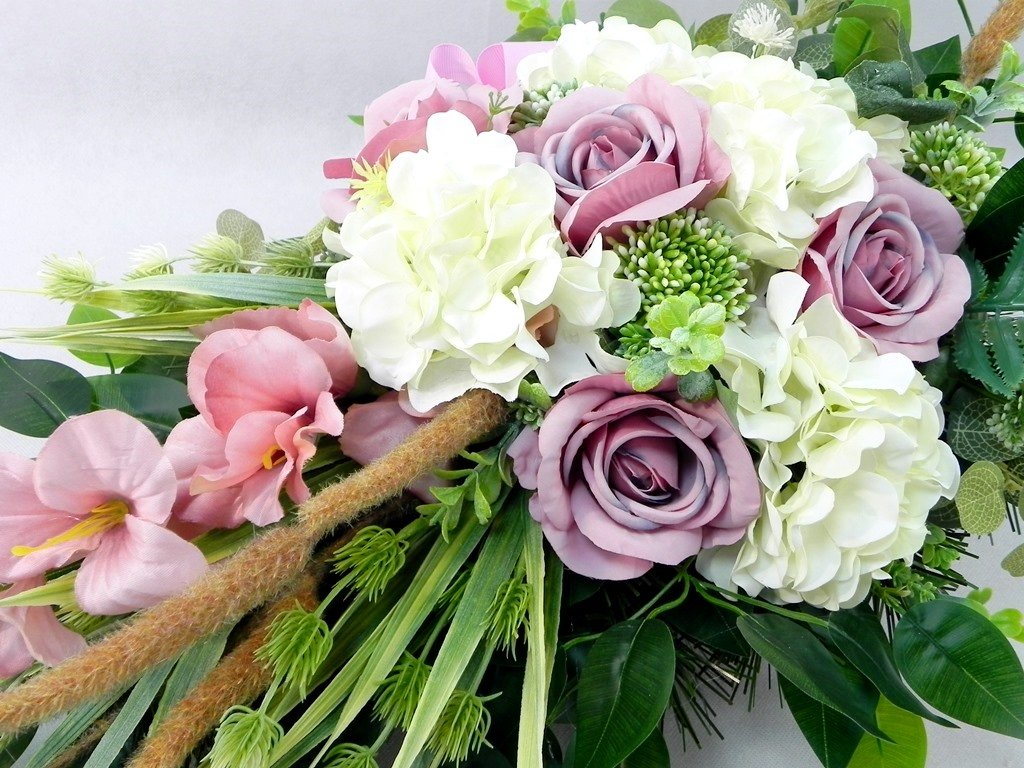 Veľmi elegantná spomienková ikebana plná ruží, hortenzii, gladiol a spomienkovej zelene.