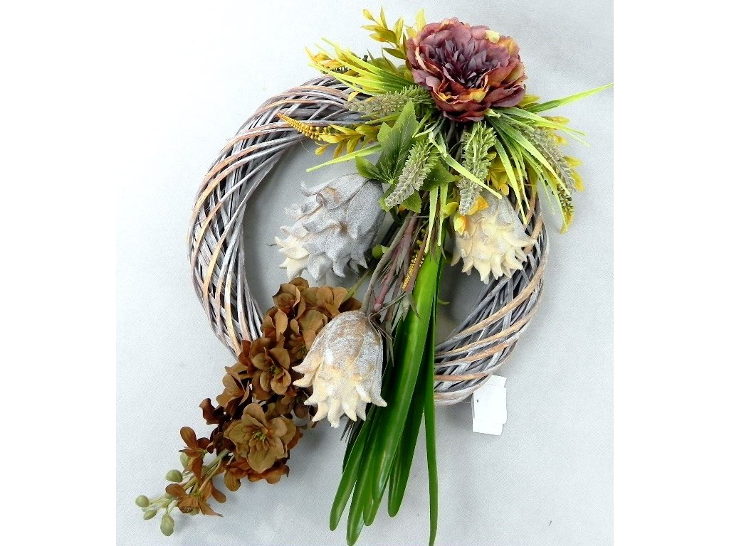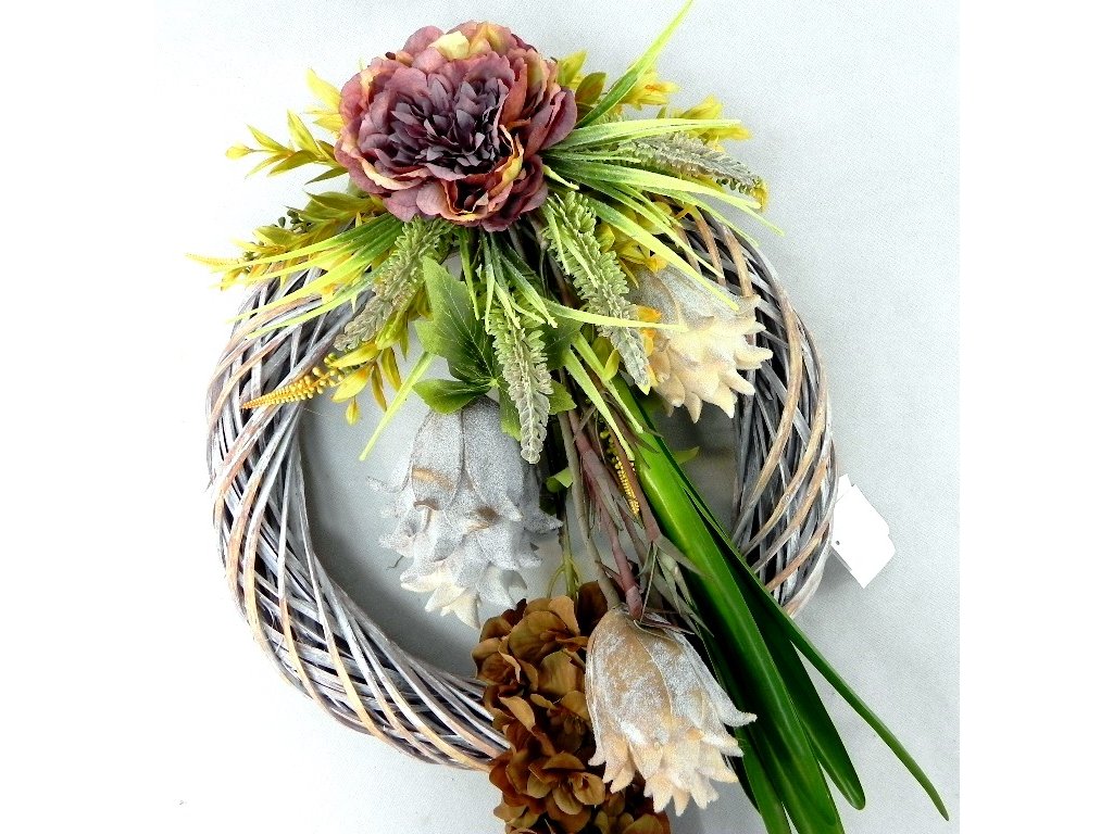 Luxusný moderný a atypický veniec na dvere s pivóniou, artičokmi a ostrôžkou. Na pevnom ratanovom kruhu o priemere 40 cm.