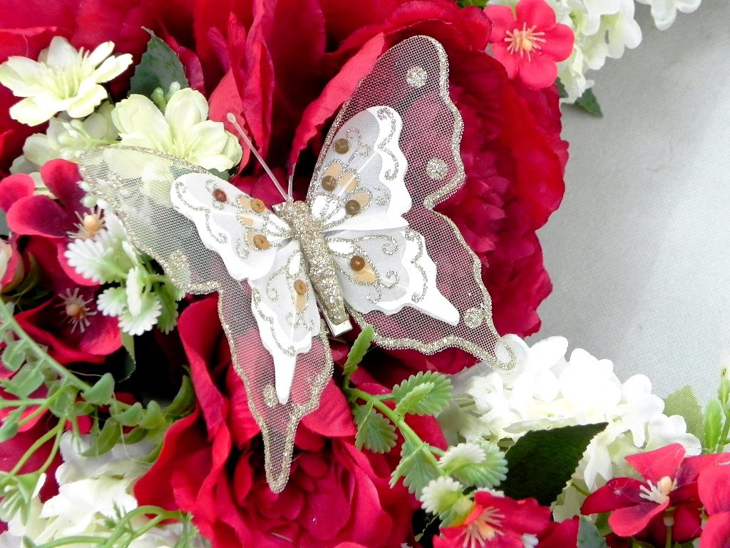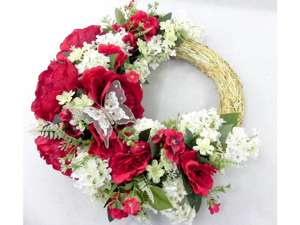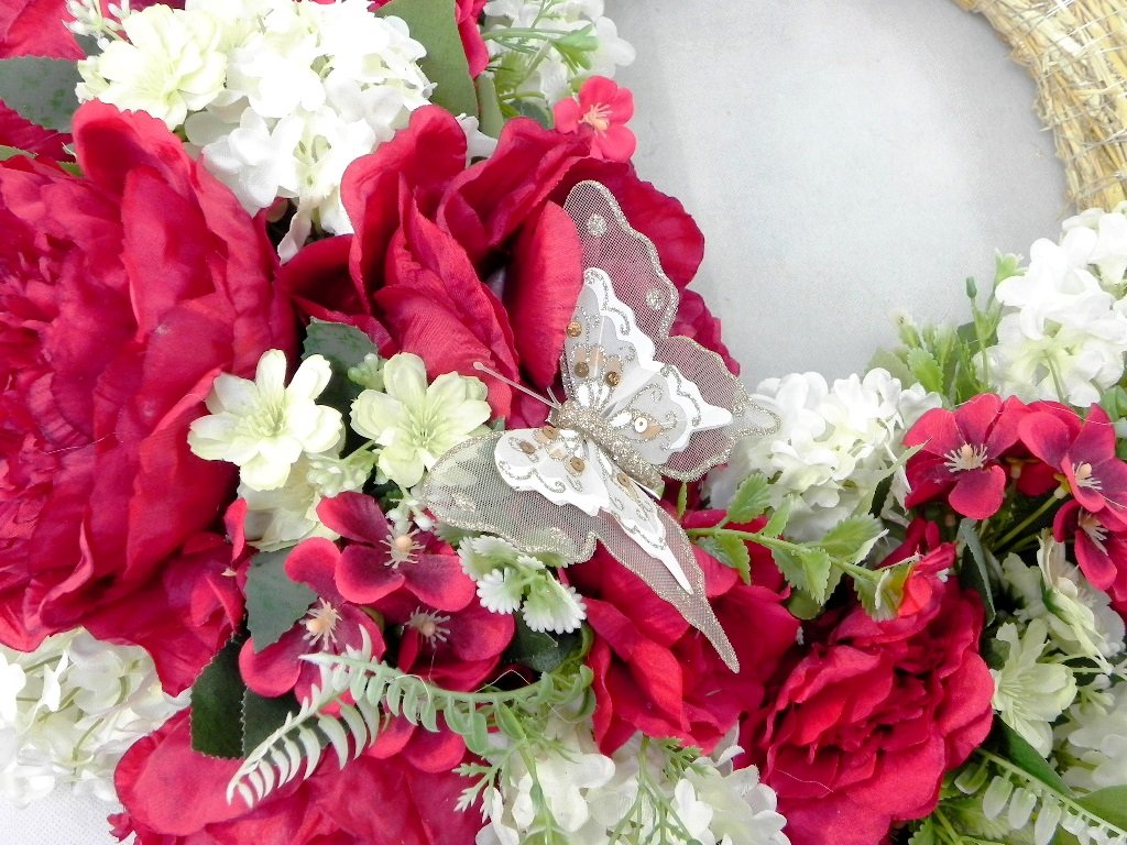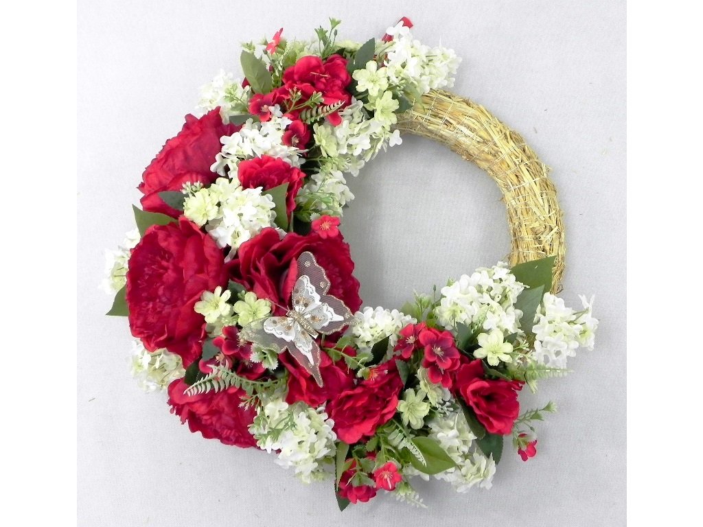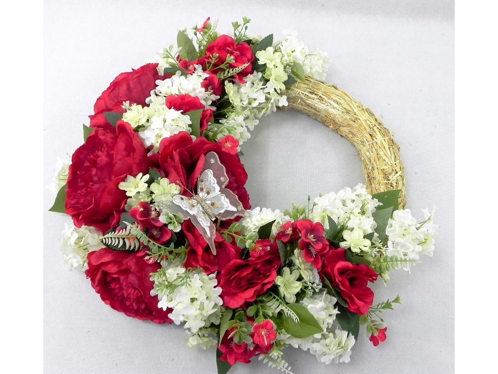 Nádherný veniec s textilnými pivóniami a orgovánom spolu s glitrovaným sieťkovým motýľom.