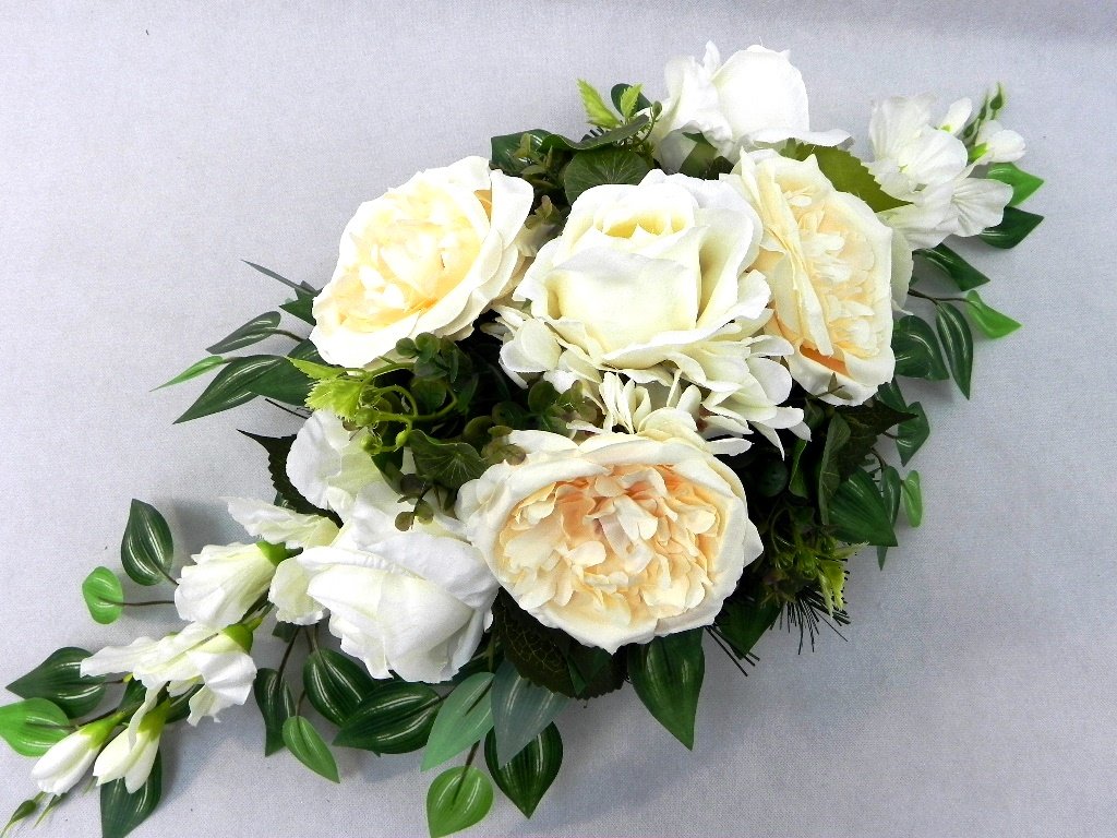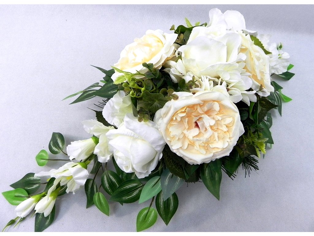 Použité hodvábne čajové anglické ruže, gladioly a doplnky dodávajú tomuto aranžmánu punc luxusu.