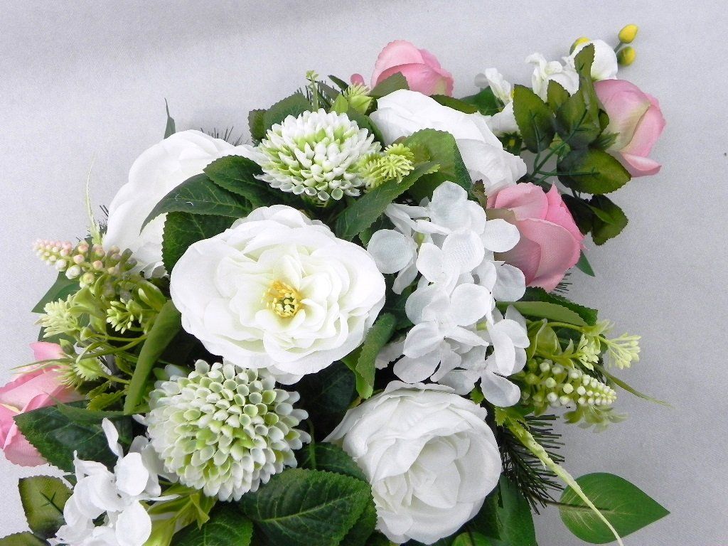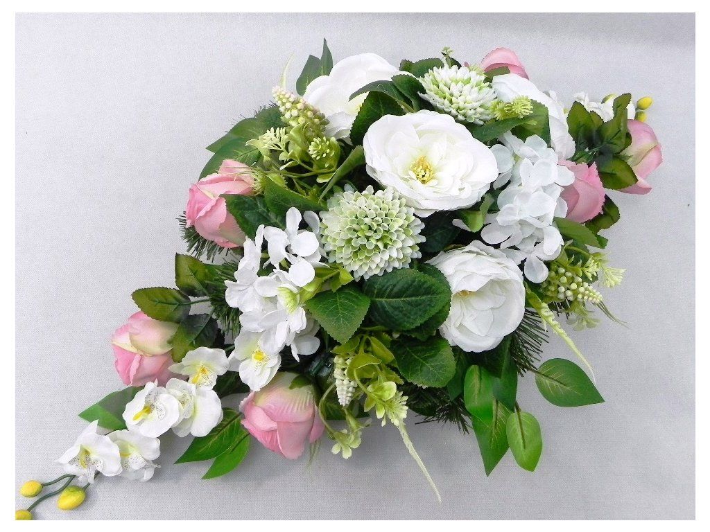 Spomienkový aranžmán s anglickými ružami, orchideami a doplnkovou zeleňou.