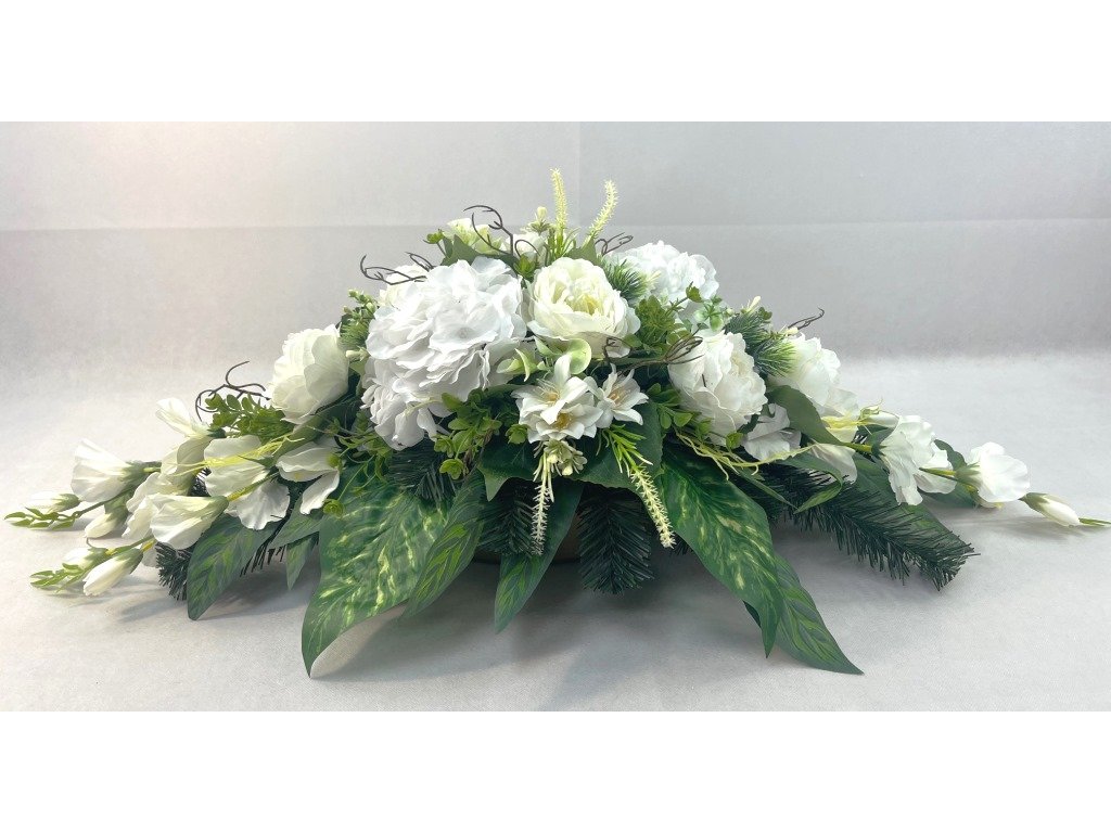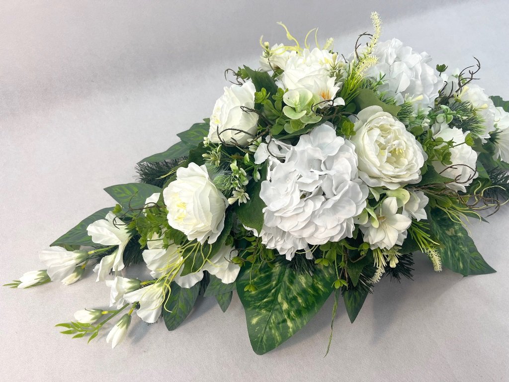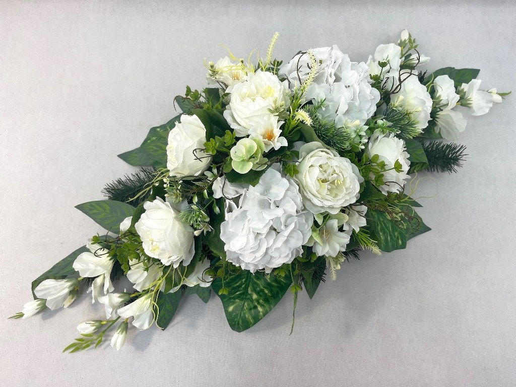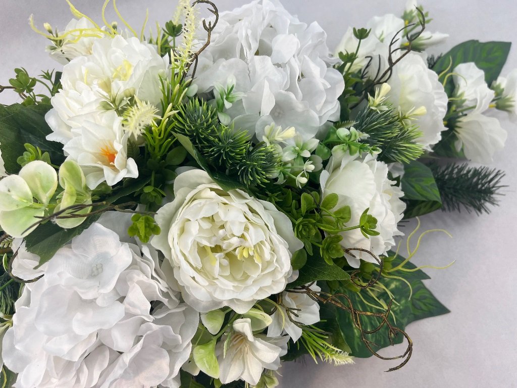 Umelé anglické ruže s ľadovými hortenziami, umelá doplnková zeleň a páry umelých gladiol.