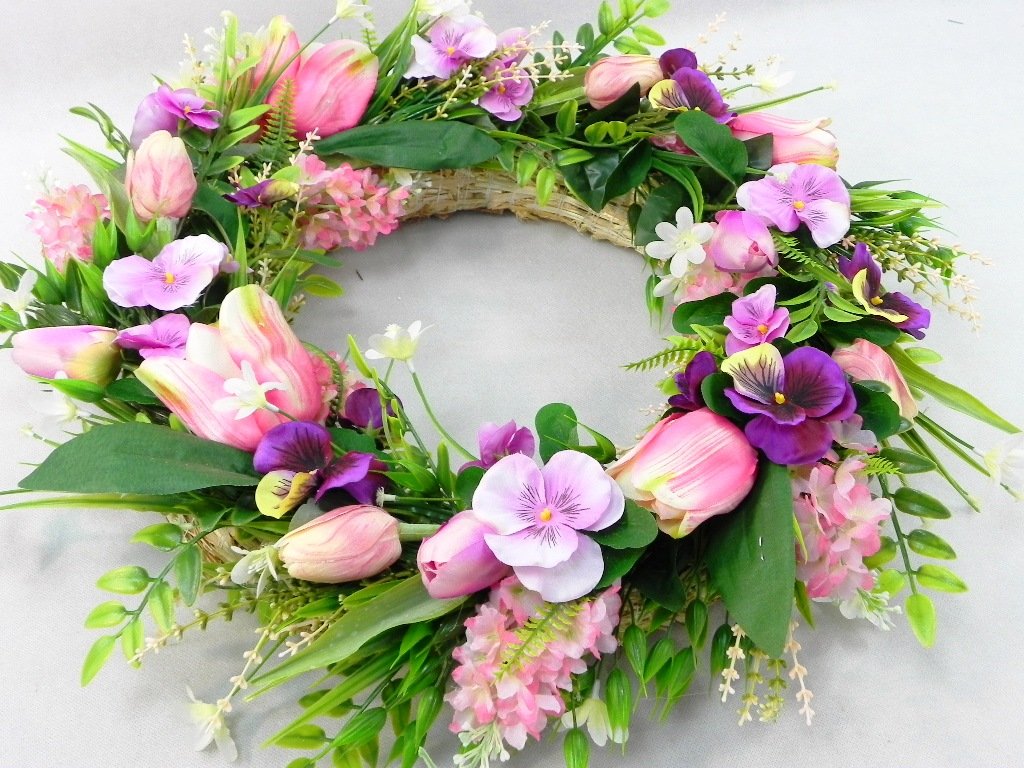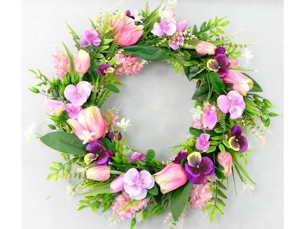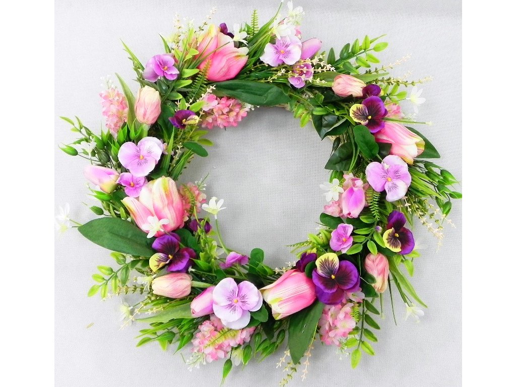 Krásny jarný veniec s tulipánmi, sirôtkami a doplnkovou zeleňou.