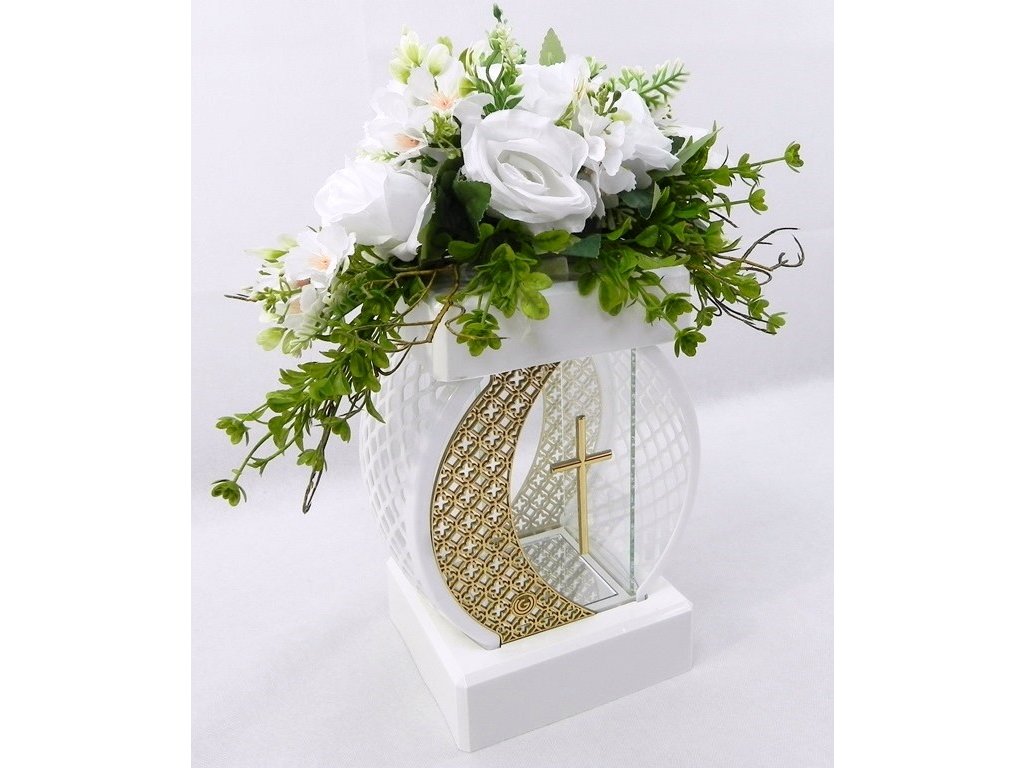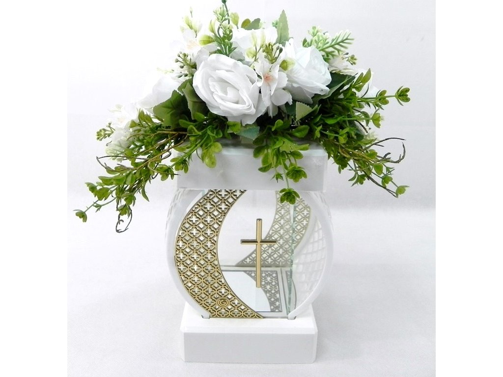 Táto moderná katedra na hrob s aranžmánom bielych umelých kvetov je ideálnou voľbou pre všetkých, ktorí hľadajú trvácnu a dôstojnú cintorínsku dekoráciu. Spojenie elegantného bieleho podstavca so zlatým krížom a bohatým kvetinovým aranžmánom pôsobí veľmi upravene a efektne na každom mieste posledného odpočinku.