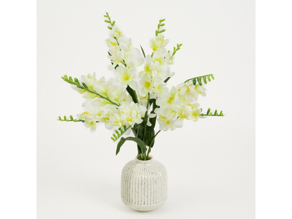 Frézie patria medzi najobľúbenejšie jarné kvety a symbolizujú čistotu, priateľstvo a novú energiu. Táto nádherná textilná verzia pôsobí veľmi prirodzene a sviežo. Bohaté kvety na jemne tvarovaných stonkách dopĺňajú realistické puky a sýtozelené listy, ktoré dodávajú aranžmánu autentický vzhľad.