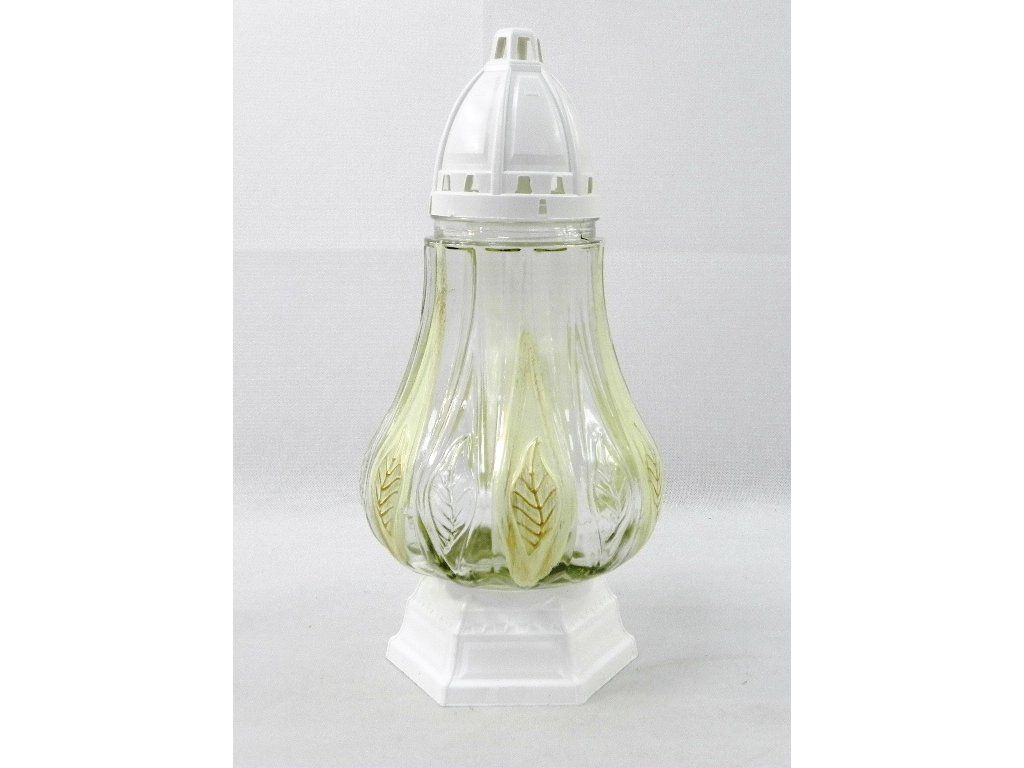 Sklenený kahanec s listami. Výška: 31 cm. Predáva sa spolu s náplňou.