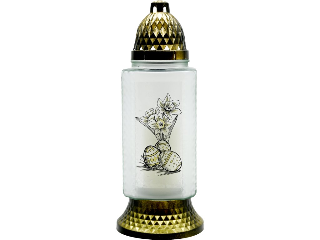 Sklenený kahanec s voskovou vyberateľnou časťou. Výška 26,5 cm. Hmotnosť vosku 120 G.