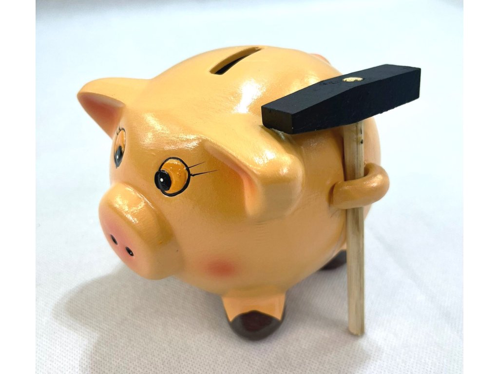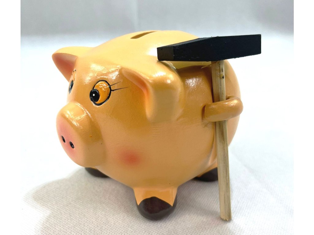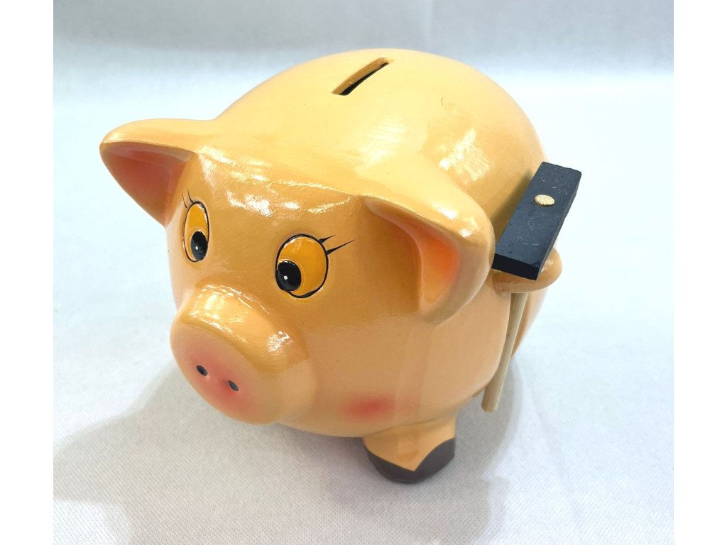 Keramická pokladnička prasiatko s kladivkom na rozbitie.