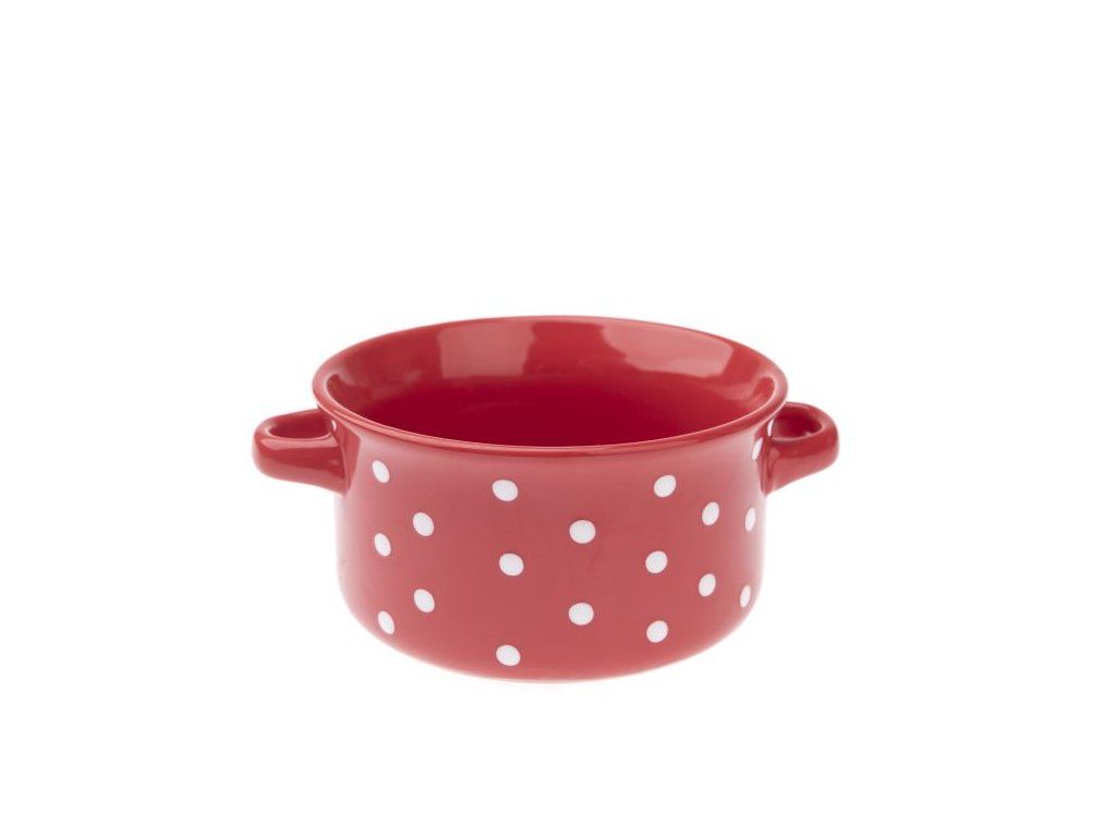 Táto pôvabná keramická miska s uchami v klasickom červenom prevedení s bielymi bodkami vnesie do vašej kuchyne hrejivú atmosféru vidieka. Je ideálna na servírovanie poctivých domácich polievok, raňajkových kaší alebo chrumkavých cereálií, pričom praktické ušká uľahčujú manipuláciu. Vďaka svojmu hravému retro dizajnu sa stane nielen obľúbeným kúskom riadu, ale aj štýlovým doplnkom, ktorý spríjemní každé stolovanie.