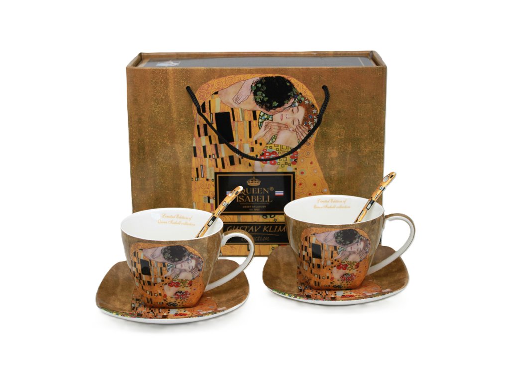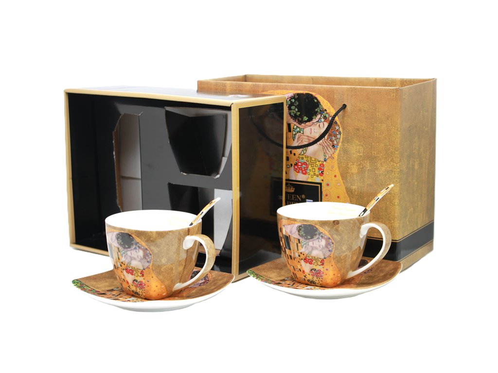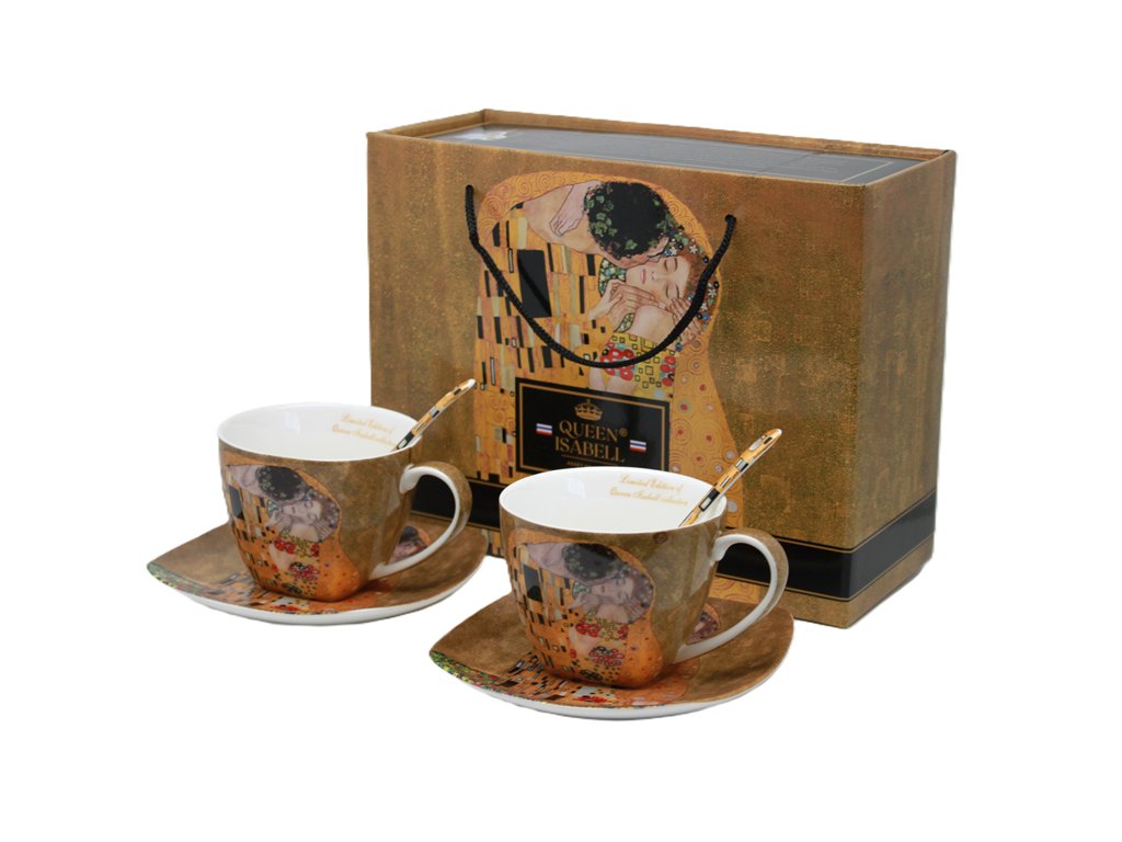 Krásna porcelánová súprava - 2 šálky, 2 tanieriky + 2 lyžičky. Motív od ak. maliara G. Klimta