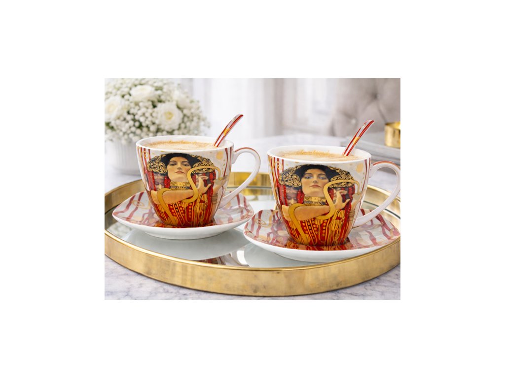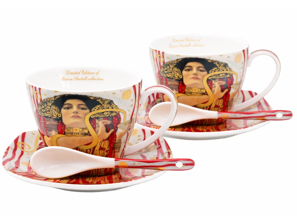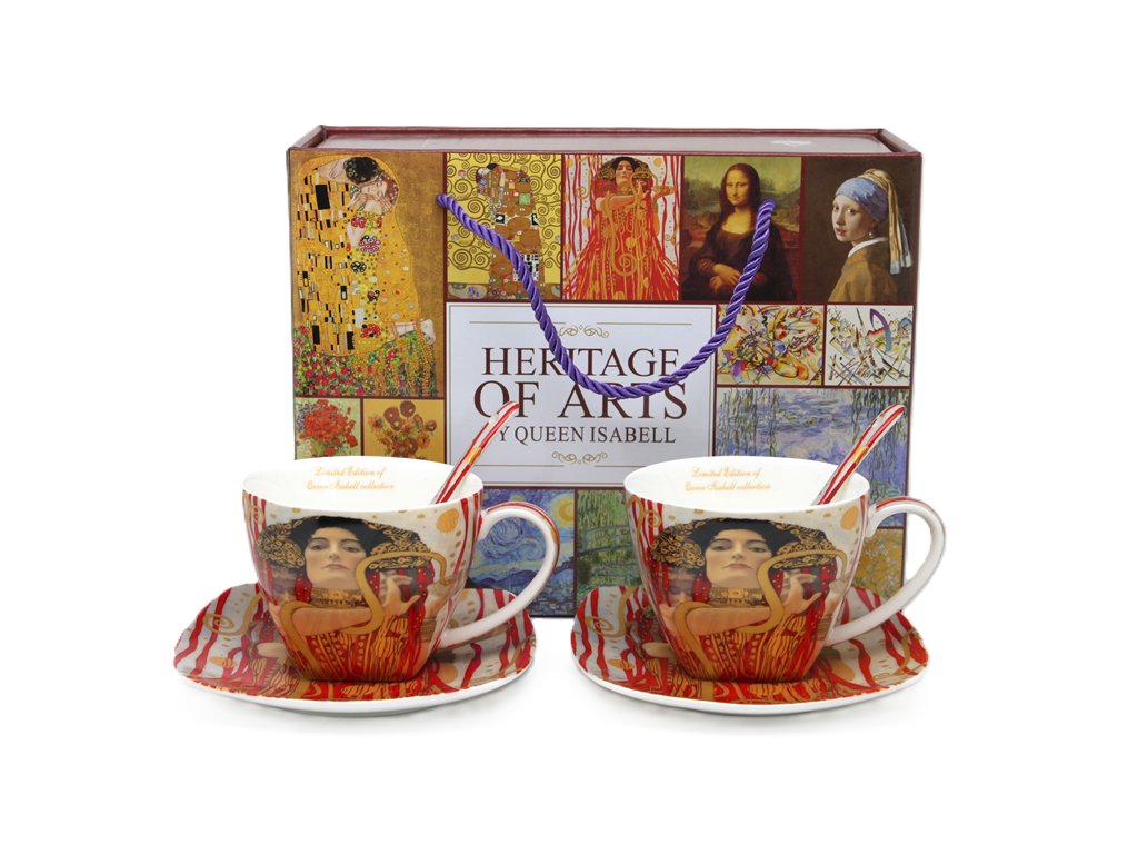 Krásna porcelánová súprava - 2 šálky, 2 tanieriky + 2 lyžičky. Motív od ak. maliara G. Klimta