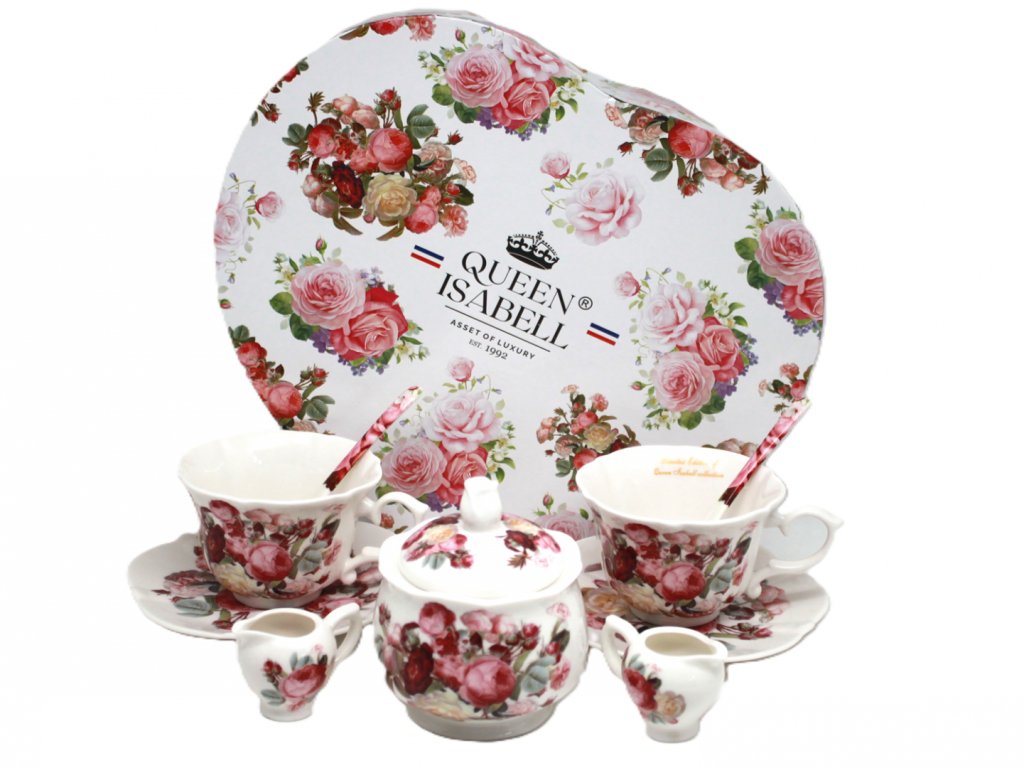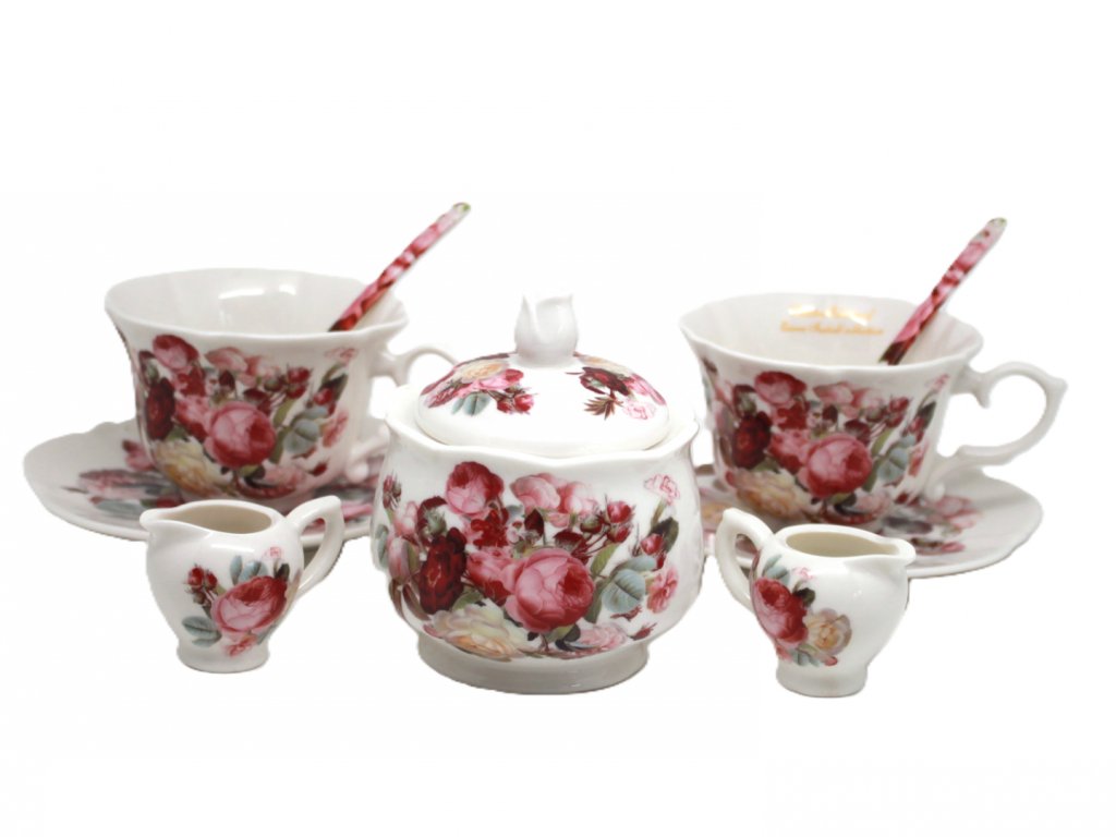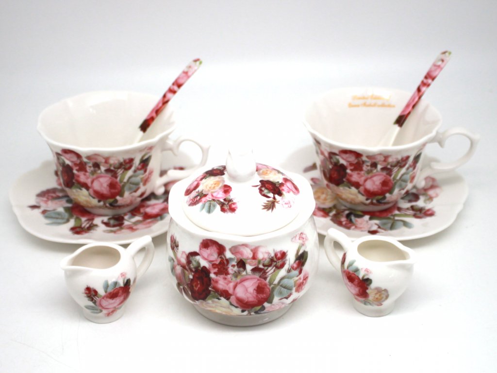 2 šálky, 2 tanieriky, 2 lyžičky, 2 mliečniky, cukornička