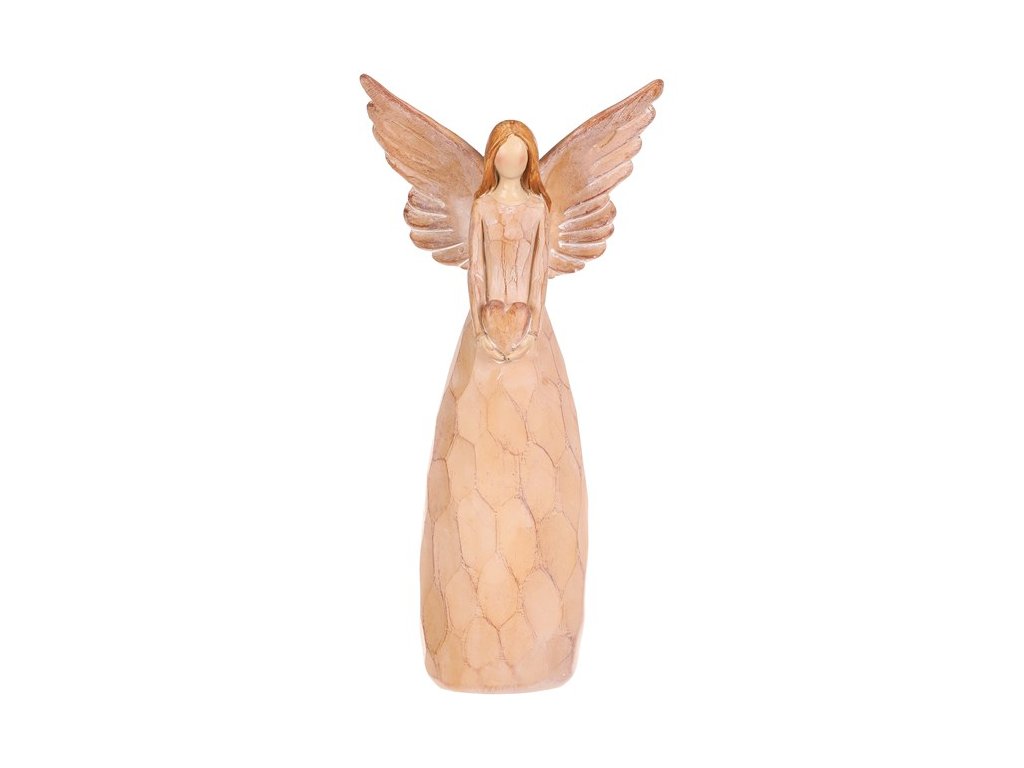 Figúrka anjela z polyresinu s vernou imitáciou dreva pôsobí ako majstrovské dielo umeleckého stolára. Nežná silueta dievčenskej postavy vo svetlo hnedej farbe s krásnou kresbou dreva, ktorý drží srdce, symbolizuje lásku, ochranu a nádej. Ide tak o ideálnu vianočnú dekoráciu na poličky aj stoly na vytvorenie pokojnej sviatočnej atmosféry.