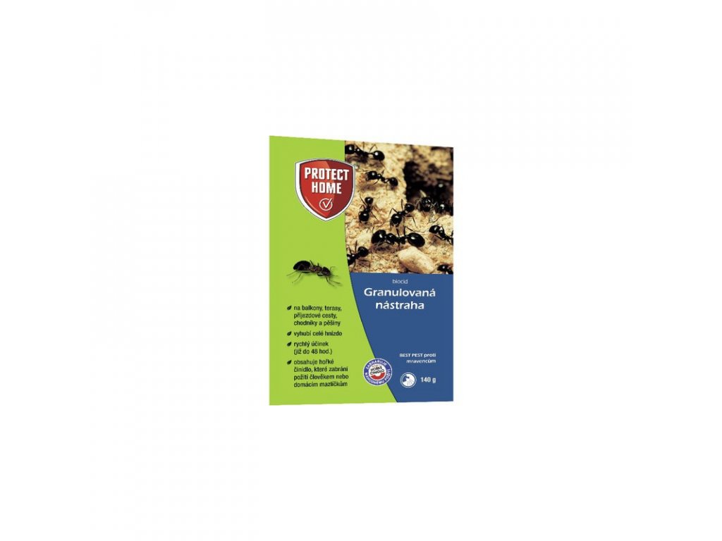 GRANULOVANÁ NÁSTRAHA NA MRAVCE PH Granulovaná nástraha na mravce Protect Home s novou účinnou látkou. Komplexné riešenie proti mravcom vo vnútri a v blízkom okolí domu. Granulovaná nástraha ochráni váš rodinný dom, byt či chatu pred mravcami čiernymi, ale i ďalšími druhmi mravcov, ktoré prichádzajú do budov z vonku. Použiť ju môžete aj na balkónoch. Prípravok proti mravcom s novou účinou látkou acetamiprid.- likvidácia mravcov posypom, postrekom alebo zalievaním - vyhubí celé hniezdo - okamžitá likvidácia mravcov s dlhodobým pôsobením - bez zápachu - ochráni váš rodinný dom, byt, chatu či blízke okolie pred mravcami čiernymi, ale i ďalšími druhmi mravcov - likviduje všetky druhy mravcov, ktoré prichádzajú do budov z vonku - hubí všetky druhy mravov na balkónoch, terasách, príjazdových cestách , chodníkoch - balenie vystačí na až na 14 hniezd (10 g prípravku na 1 m2 plochy, kde žijú mravce alebo na 1 hniezdo mravcov) - obsahuje benzoesandenatonium - horké činidlo, ktoré zabráni požitiu človekom alebo domácim miláčikom.Granulovaná nástraha na mravce je mikro-granulát, pripravený na použitie pre dlhodobú kontrolu mravcov