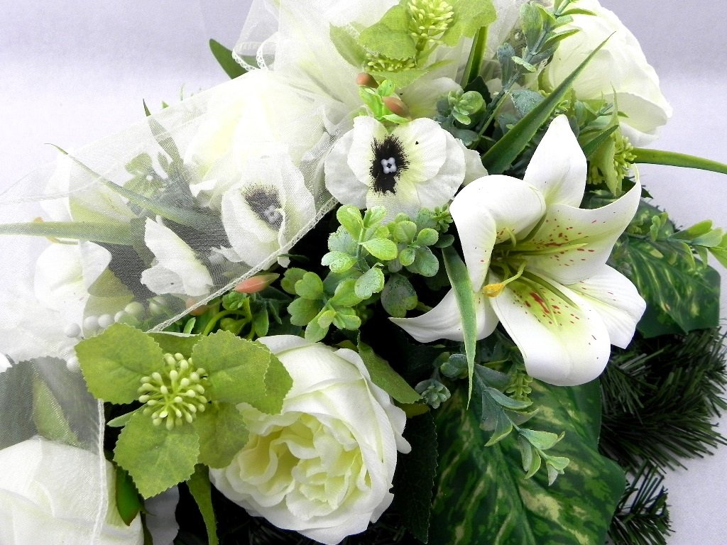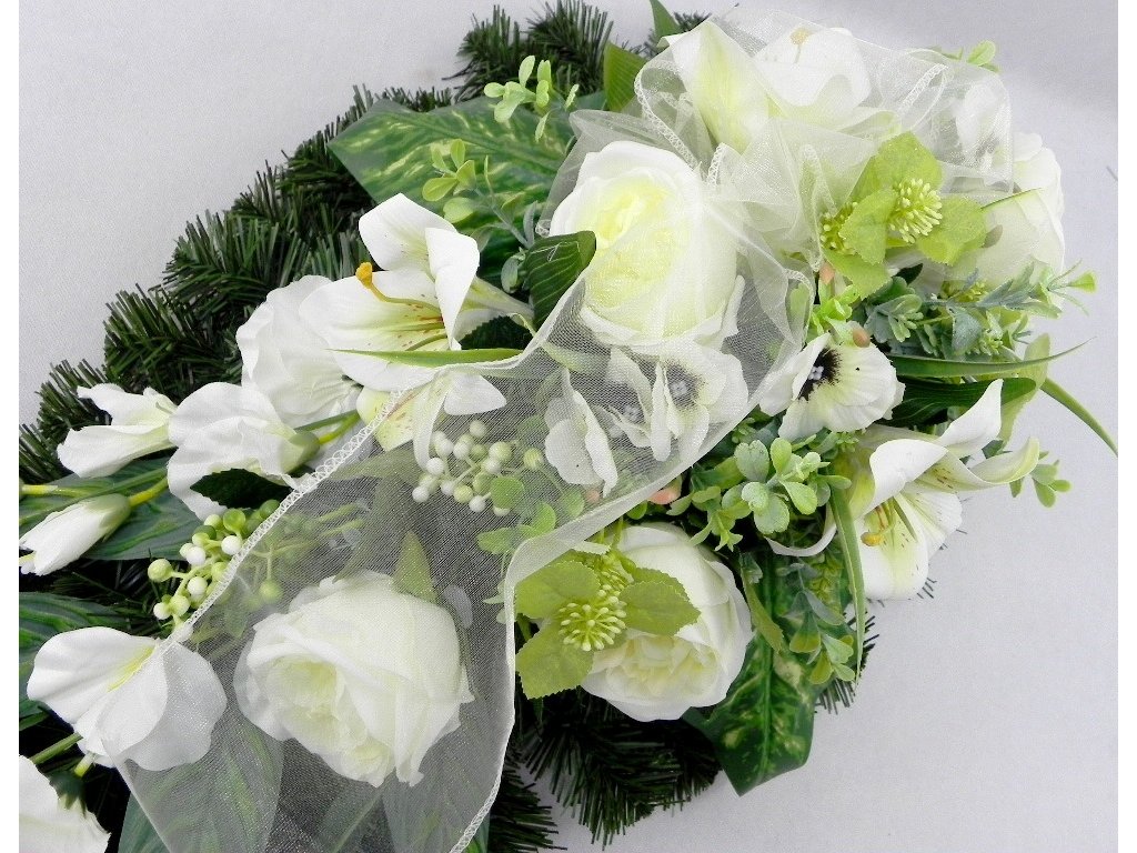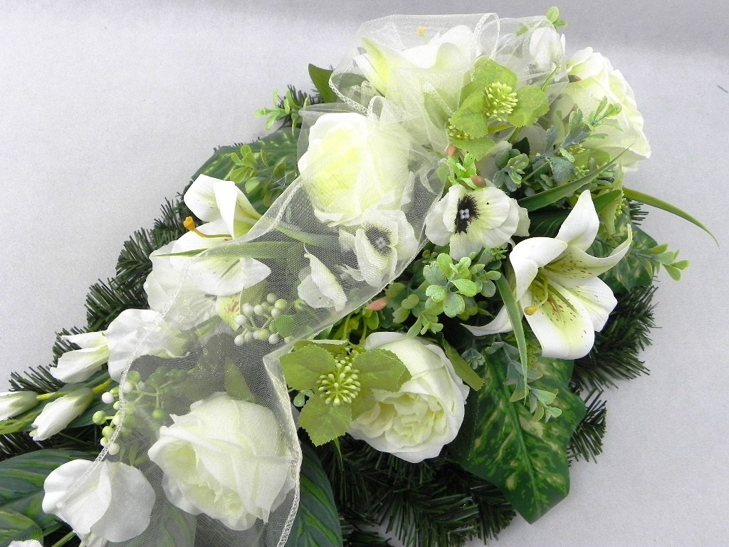 Kvalitné ruže, čajové ruže, ľalie, sirôtky a doplnková zeleň vytvoria elegantnú spomienkovú výzdobu, alebo kondolenčný aranžmán.