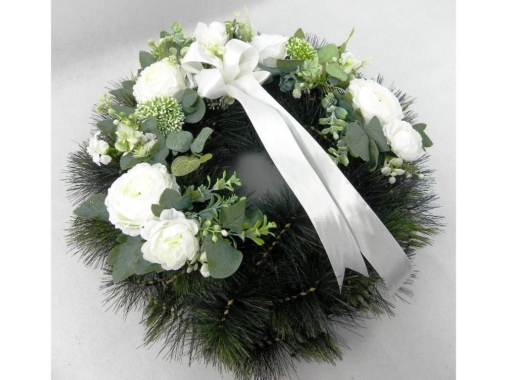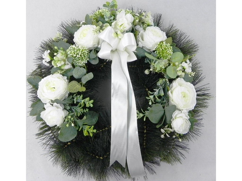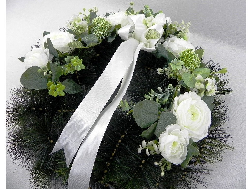 Luxusný smútočný veniec, bohato zdobený umelými kvetmi.