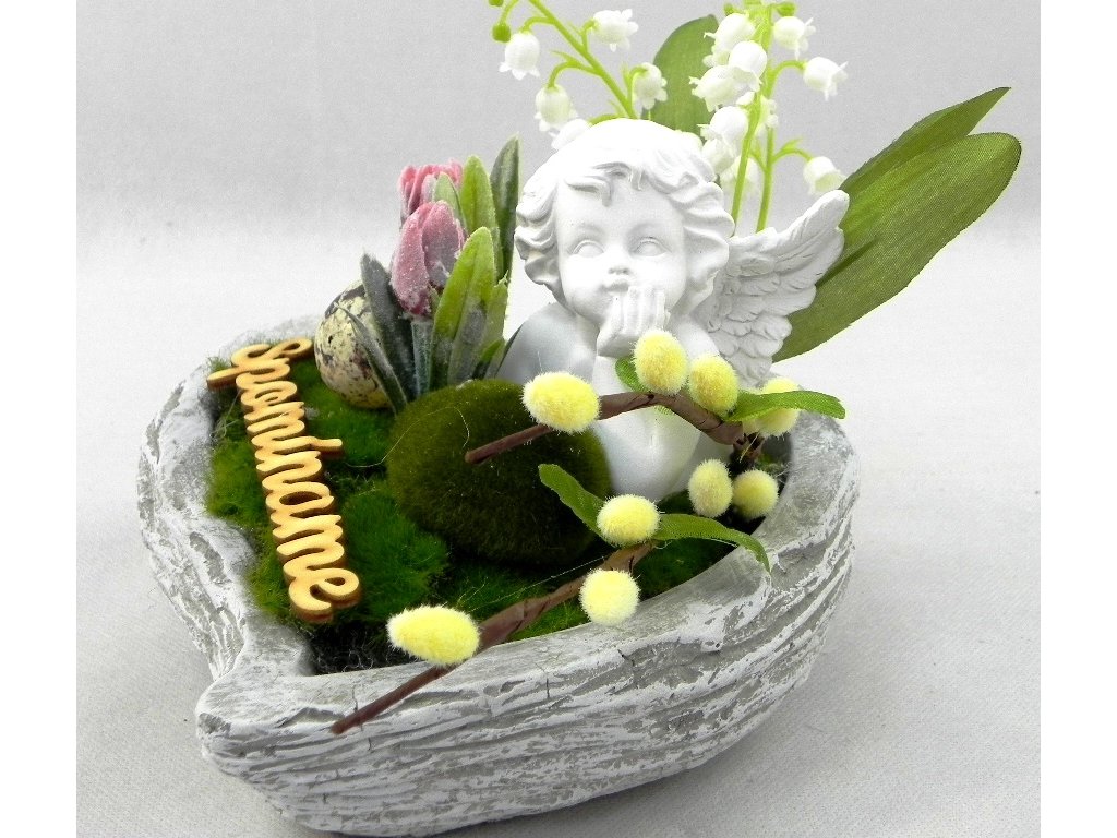 Betónové srdiečko s anjelikom v machu spolu s tulipánikmi a jarnými bahniatkami.