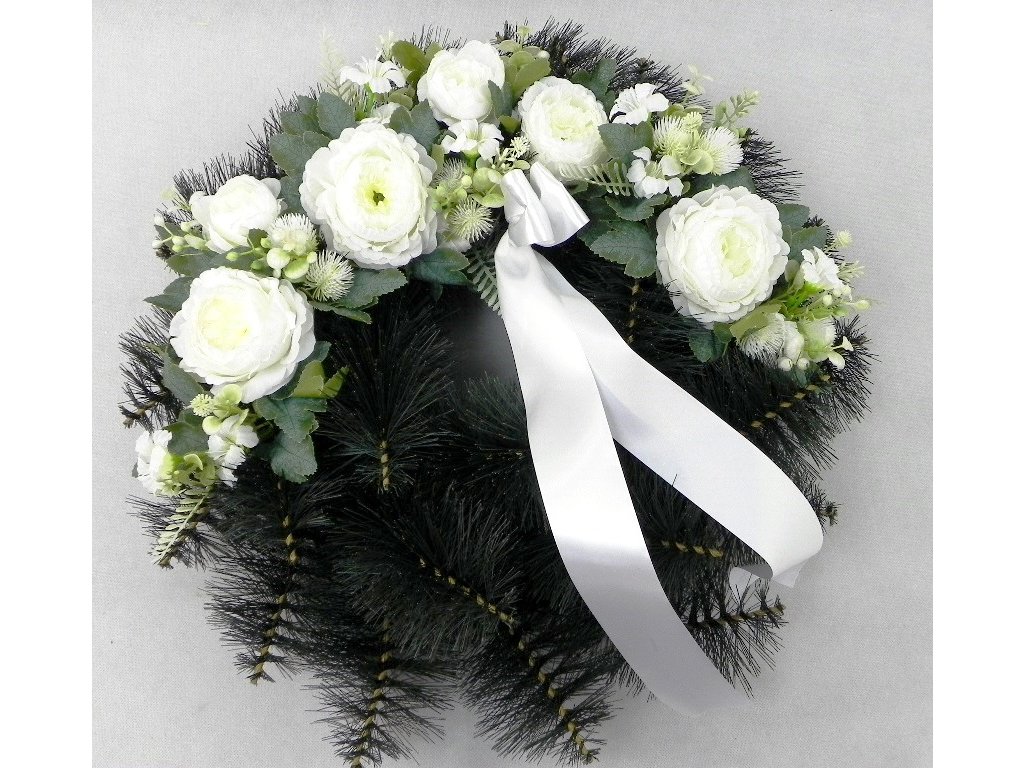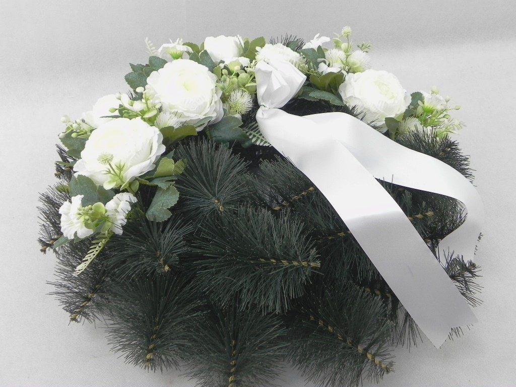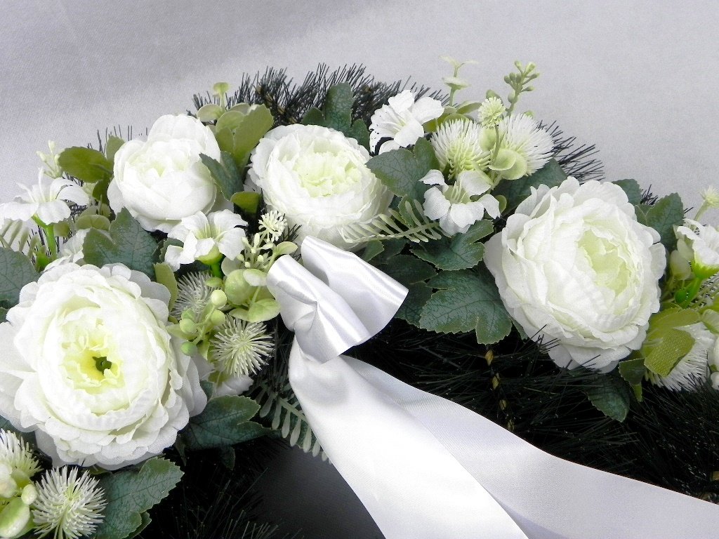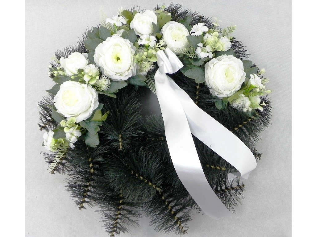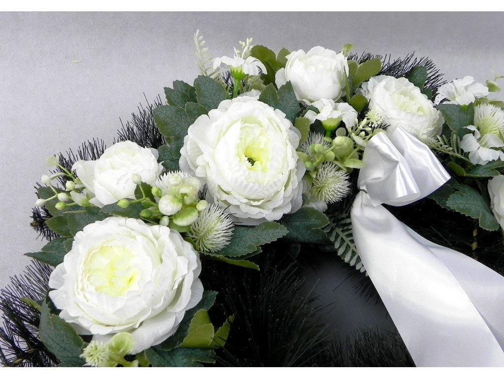 Elegantný spomienkový/ smútočný veniec s ružami a doplnkovou zeleňou.