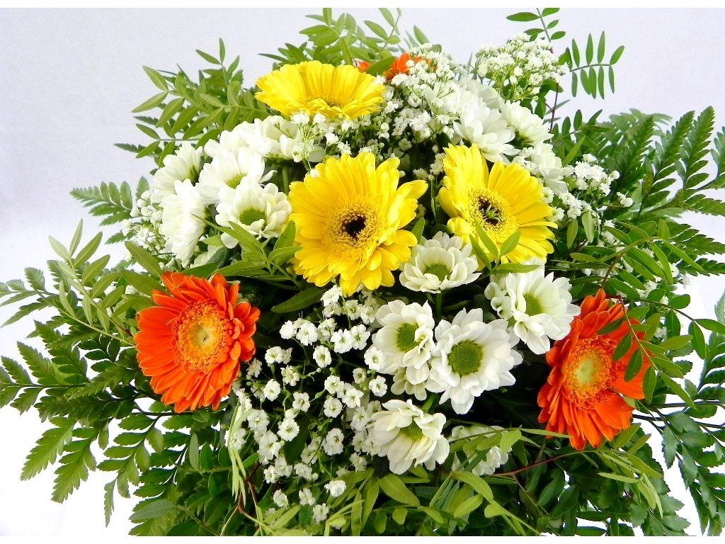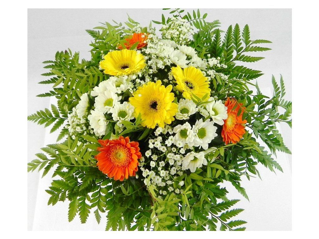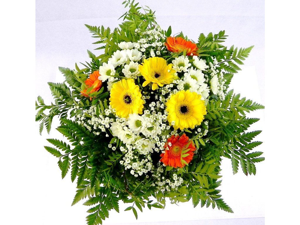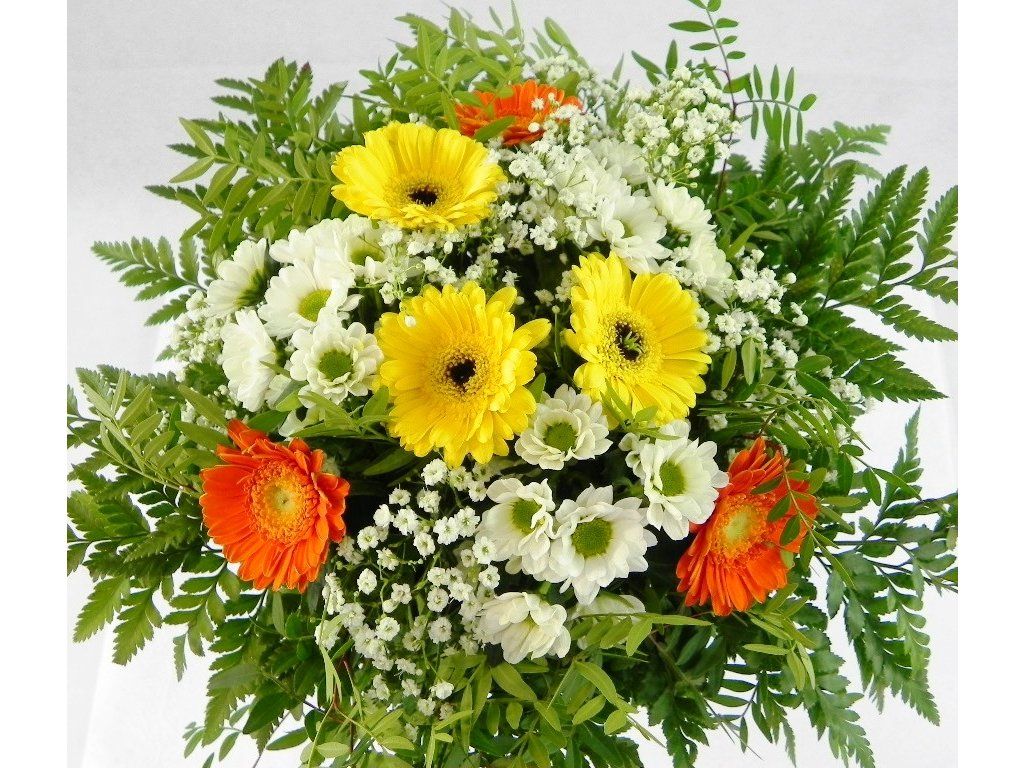 Nádherná bohatá kytica živých gerbier, drobných kamiliek a gypsofily doplnená hustou obrubou zelene.